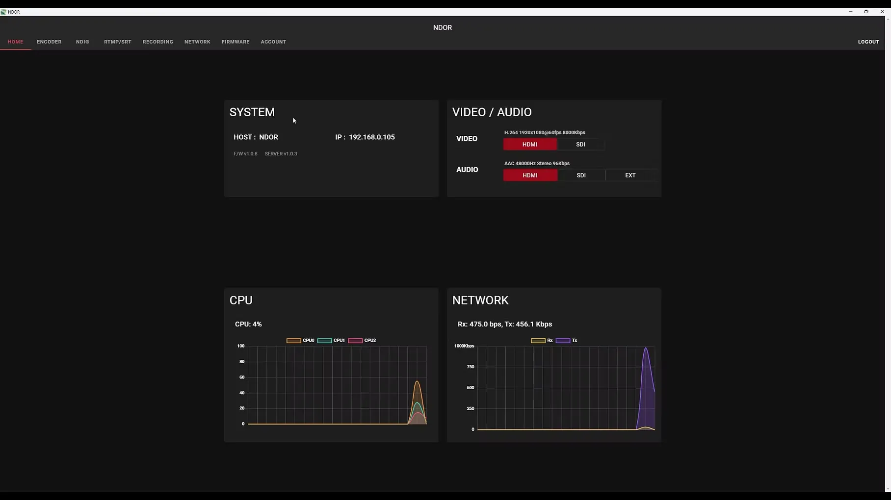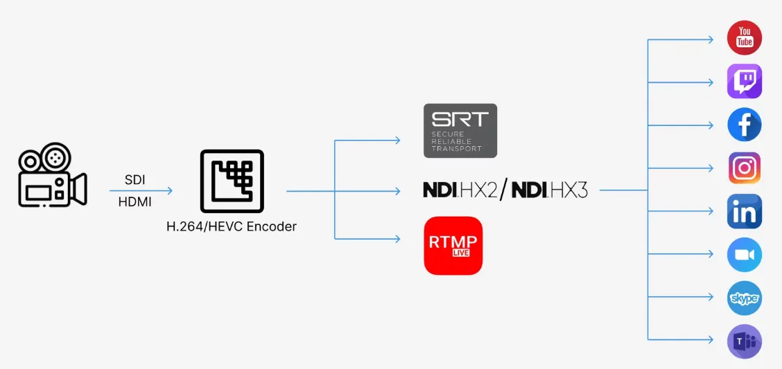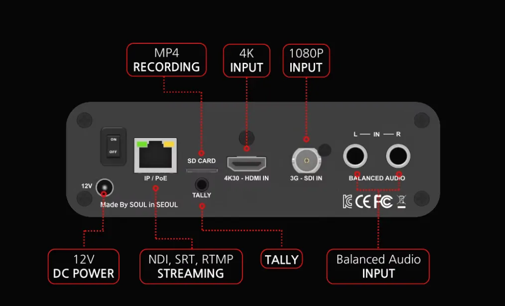 ·Video Output: Encoding- H.264, H.265 Stream- NDI HX2, NDI HX3, SRT, RTMP Ethernet : (Gigabit) x 1- 10M/100M/1000M RJ45 (PoE supported 802.3af)